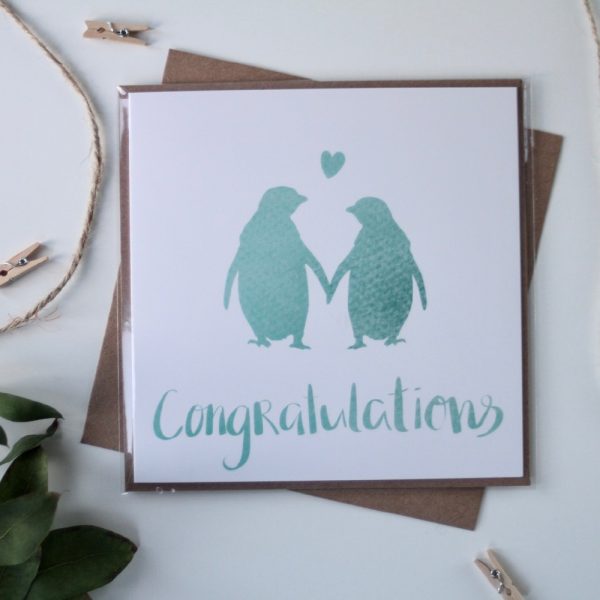 A beautifully hand lettered and illustrated congratulations card featuring two penguins hand in hand, or flipper in flipper! Perfect as an engagement, wedding or anniversary card.